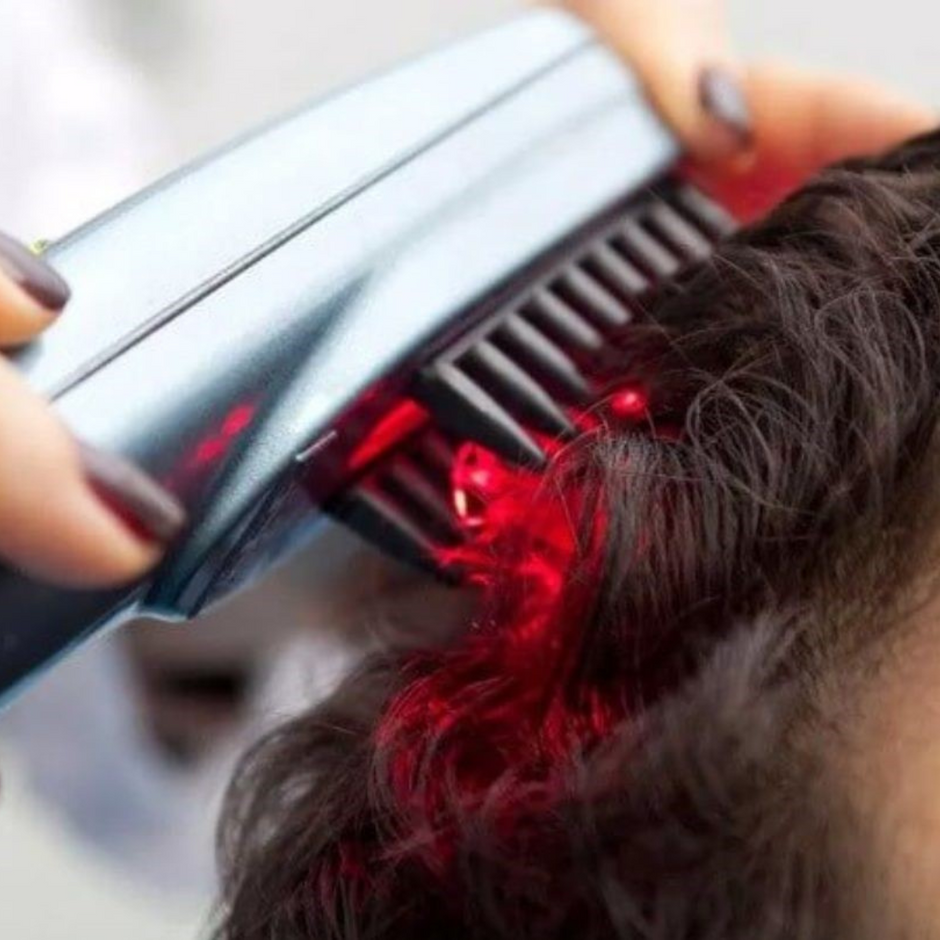 Red light therapy uses light in the 600-700nm range which is thought to increase cellular activity and stimulation of the hair follicles.